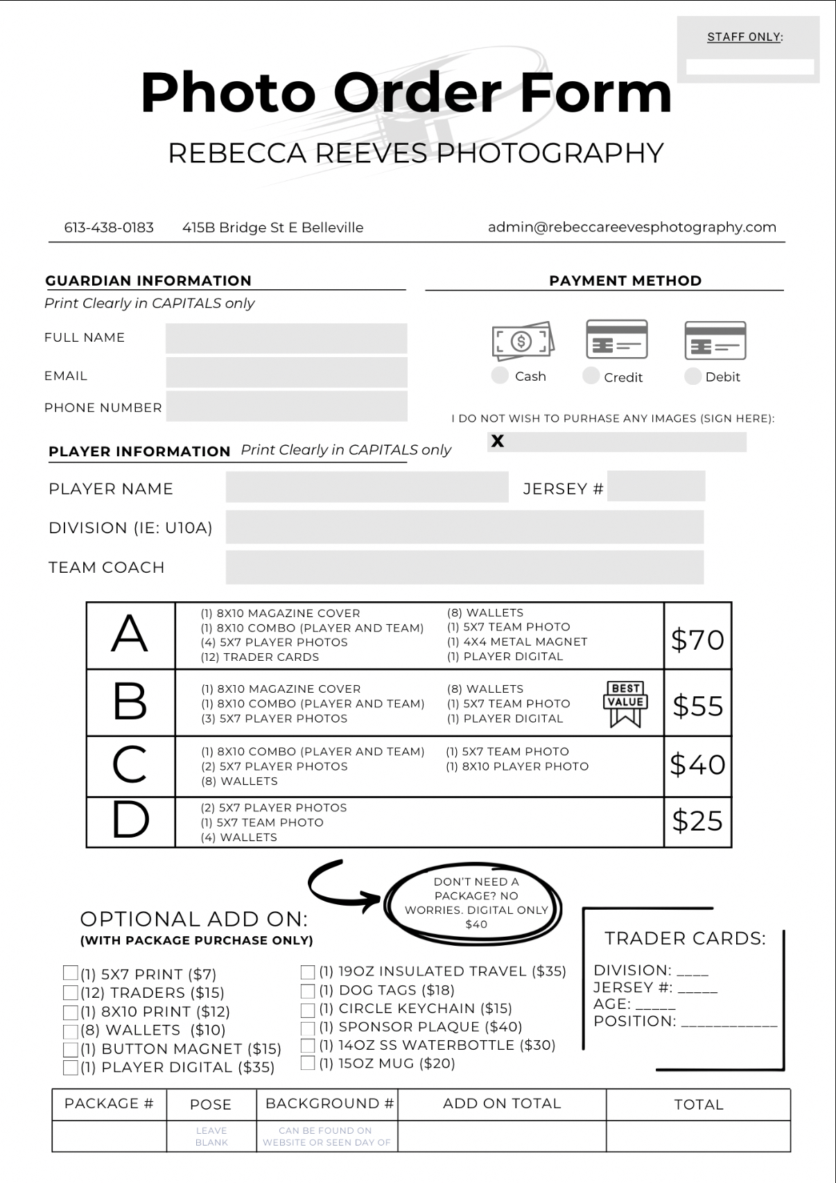 Print and review the order form. Fill out all information required, including your package and background selections.